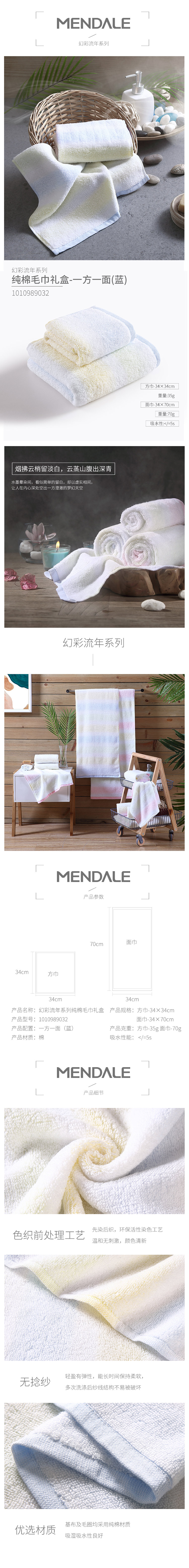 梦洁家纺 幻彩流年系列纯棉毛巾礼盒 一方一面(蓝) 34*70cm 34*34cm纯棉